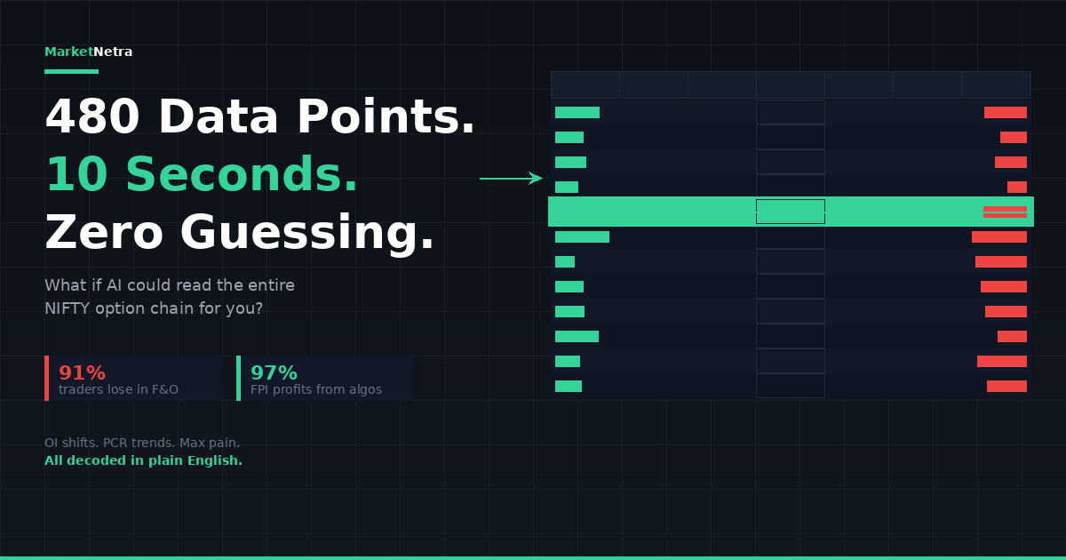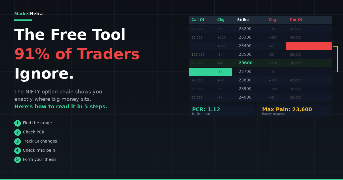 The NIFTY option chain is free, updates every second, and shows where big money sits. Yet 91% of traders ignore it. Learn to read OI, PCR, max pain, and support/resistance in 5 steps.