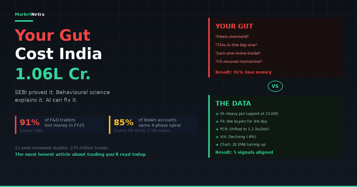 ₹1.06 lakh crore lost by Indian F&O traders in one year. 91% lost money. The science of why your gut fails at trading — and how data-driven AI tools fix the exact biases that destroy accounts.